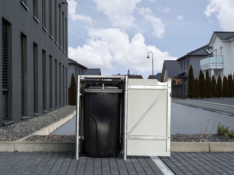 Kovový box na smetné nádoby Hide je praktickým riešením na uloženie smetných nádob s objemom 240 l. Vďaka elegantnému čiernemu prevedeniu zapadne ku každému domu či do záhrady a zároveň ochráni nádobu pred poveternostnými vplyvmi a vlhkosťou.