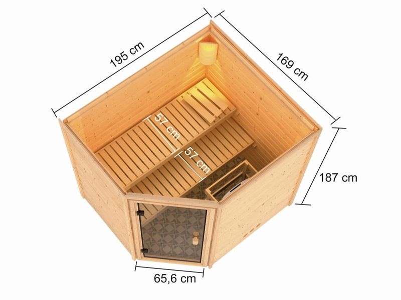 Fínska sauna má rozmer 195 × 169 cm s rohovými dverami. Sauna je celá vyrobená z dreva severského smreku. Drevo pochádza zo vzdialeného severu Európy a je chemicky úplne neošetrené (nie je ani namorené ani nalakované). V dôsledku toho je prosté všetkých známych problematických látok, ktoré by sa v priebehu saunovania mohli z dreva uvoľňovať.