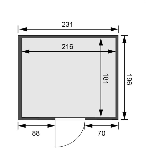 Fínska sauna má obdĺžnikový tvar 231 × 196 cm. Saunu dodávame bez dodatočného dreveného profilu pri strope a bez LED osvetlenia.