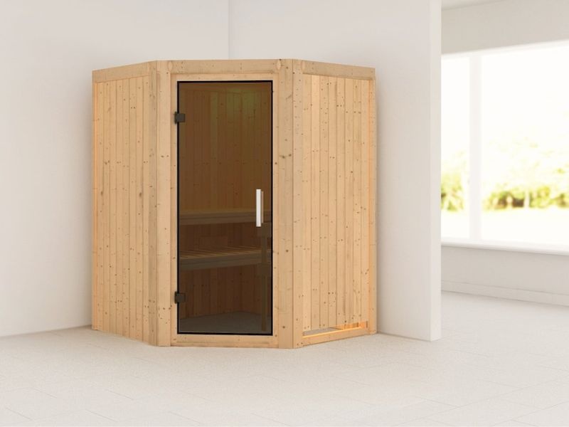 Menšia fínska sauna má rozmer 151 × 151 cm s rohovými dverami. Saunu dodávame bez dodatočného dreveného profilu pri strope a bez LED osvetlenia. Sauna je celá vyrobená z dreva severského smreku.