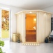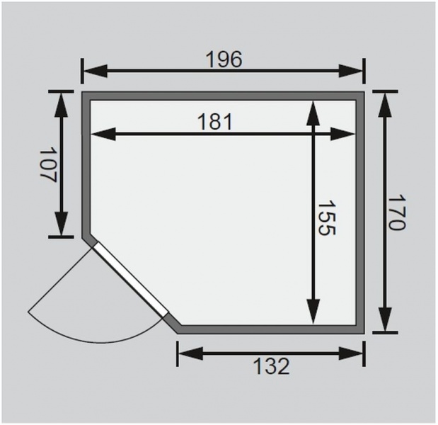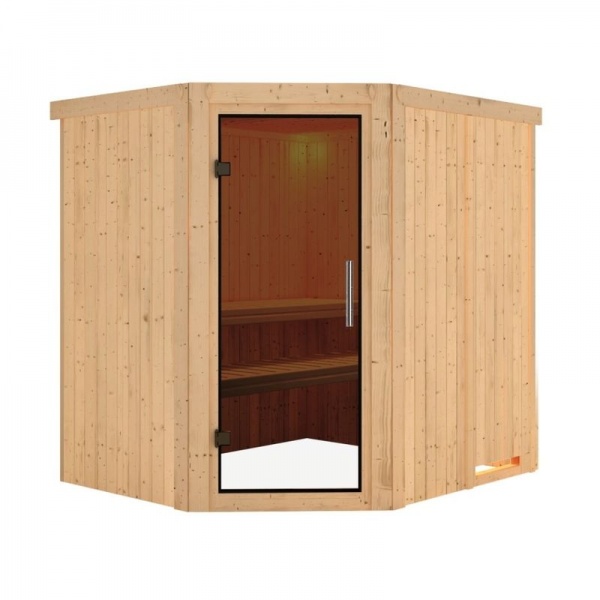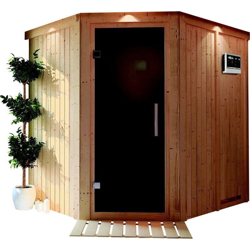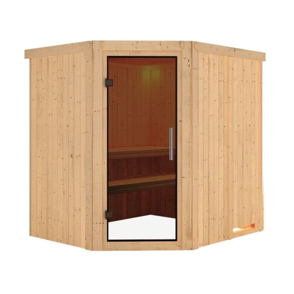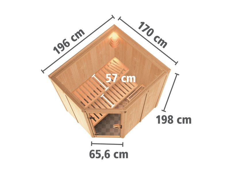 Domáca fínska sauna určená pre dve osoby. Má rozmery 196 × 170 cm s rohovými dverami. Saunu dodávame bez dodatočného dreveného profilu pri strope a bez LED osvetlenia.