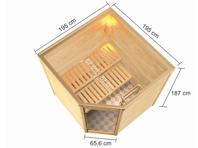 Fínska sauna má rozmer 195 × 195 cm s rohovými dverami. Sauna je celá vyrobená z dreva severského smreku. Drevo pochádza zo vzdialeného severu Európy a je chemicky úplne neošetrené (nie je ani namorené ani nalakované). V dôsledku toho je prosté všetkých známych problematických látok, ktoré by sa v priebehu saunovania mohli z dreva uvoľňovať.