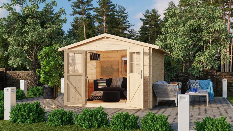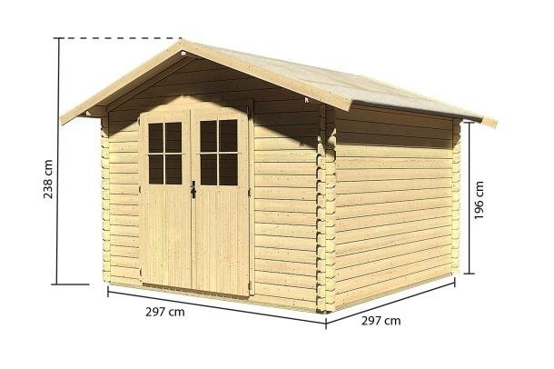 Drevený záhradný domček. Rozmery: š. 2,97 × d. 2,97 m. Sila steny: 28 mm. Domček je ideálny pre relaxáciu na záhrade. Zastavaná plocha: 8,82 . Podlaha + strešná lepenka ZADARMO.