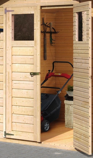 Základný model dreveného domčeka pre vašu záhradu. Tento model má sedlovú strechu a dvojkrídlové dvere na pántoch s oknom v každom krídle. Stavebným materiálom domčeku sú drevené profily hrúbky 19 mm perfektne vyfrézovane zo severského smreku.