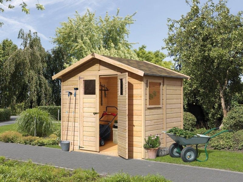 Základný model dreveného domčeka pre vašu záhradu. Tento model má sedlovú strechu a dvojkrídlové dvere na pántoch s oknom v každom krídle. Stavebným materiálom domčeku sú drevené profily hrúbky 14 mm perfektne vyfrézovane zo severského smreku.