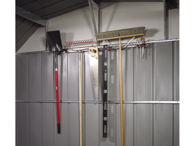 Vďaka priloženým háčikom jednoducho uložíte a usporiadate metly, hrable na lístie, lopaty, kefy a mnoho ďalšieho.