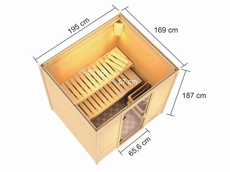 Interiérová sauna je vyrobená z masívneho dreva sily 38 mm. Steny sauny sú zložené zo špeciálne hladených dosiek s dvojitým perom a drážkou, čo garantuje neobyčajnú pevnosť spoja.