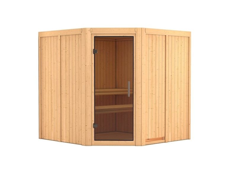 Fínska sauna má rozmer 196 × 196 cm s rohovými dverami. Saunu dodávame bez dodatočného dreveného profilu pri strope a bez LED osvetlenia. Sauna je celá vyrobená z dreva severského smreku.
