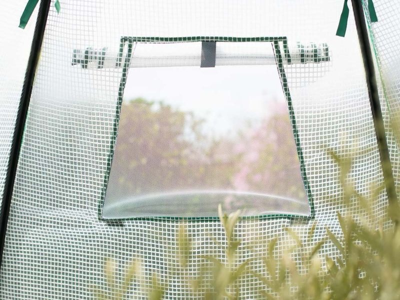 Stabilná oceľová konštrukcia je potiahnutá odolnou UV-stabilnou fóliou, ktorá v lete chráni pred priamym slnkom a v zime izoluje pred chladom. Praktické dvere na zips umožňujú pohodlný vstup a integrované vetracie okno zabezpečuje cirkuláciu vzduchu vo vnútri stanu.