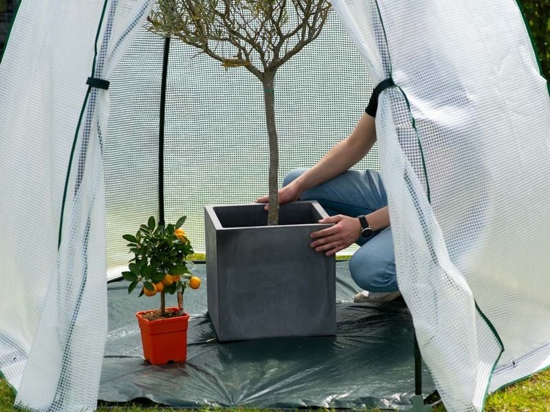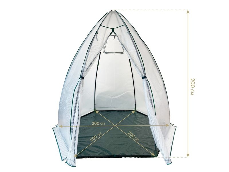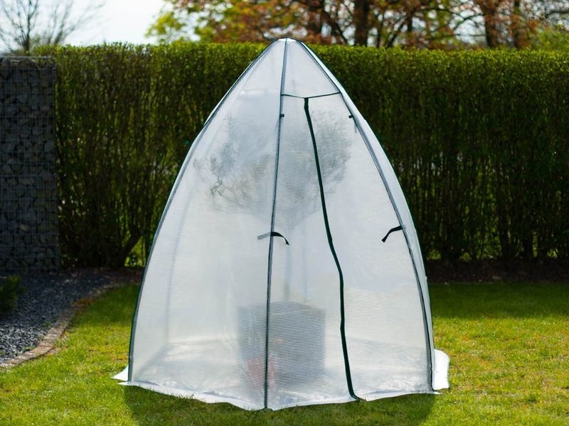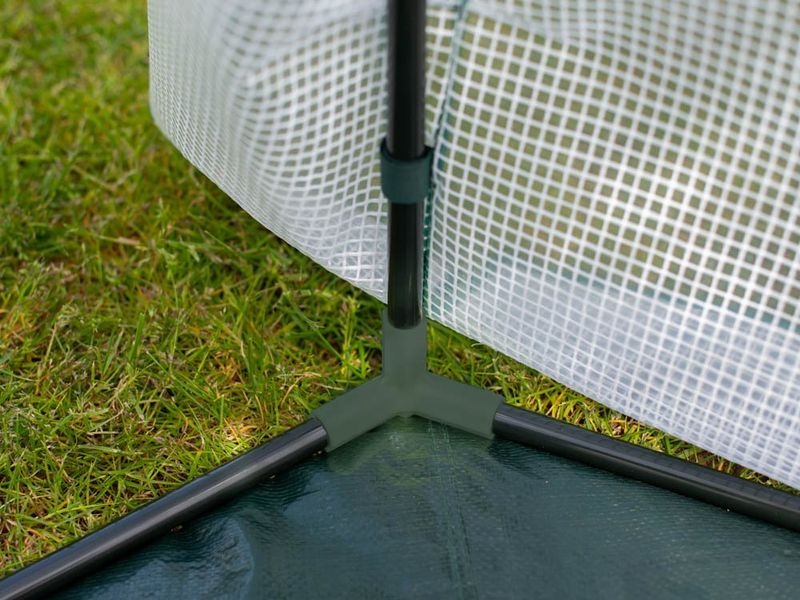 Stabilná oceľová konštrukcia je potiahnutá odolnou UV-stabilnou fóliou, ktorá v lete chráni pred priamym slnkom a v zime izoluje pred mrazom. Praktické dvere na zips umožňujú jednoduchý vstup a integrované vetracie okno zabezpečuje cirkuláciu vzduchu vo vnútri.