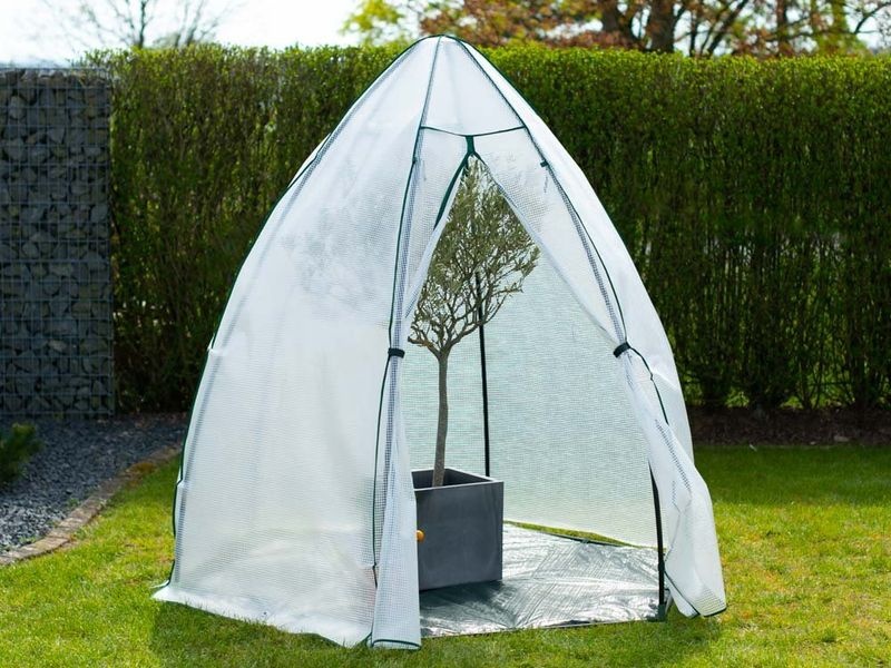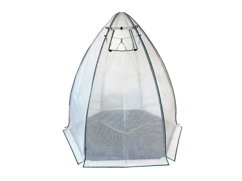Stabilná oceľová konštrukcia je potiahnutá odolnou UV-stabilnou fóliou, ktorá v lete chráni pred priamym slnkom a v zime izoluje pred mrazom. Praktické dvere na zips umožňujú jednoduchý vstup a integrované vetracie okno zabezpečuje cirkuláciu vzduchu vo vnútri.