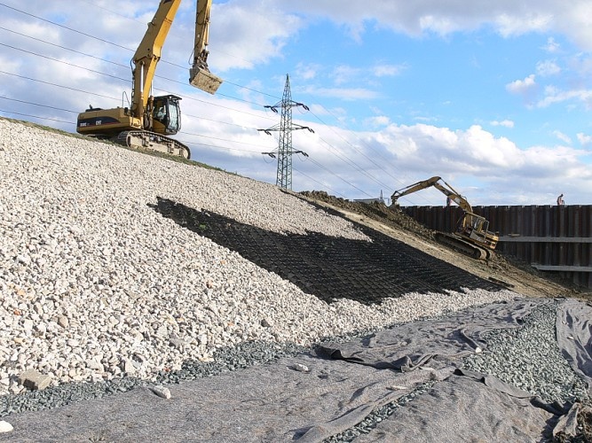6. Po ukotvení protieróznej ochrany najskôr zasypte kotevné ryhy a potom vyplňte samotné geobunkové pásy. Ako výplňový materiál sa využíva ornica alebo štrk (výška zásypu = výška steny geobunky + 20–50 mm materiálu naviac).