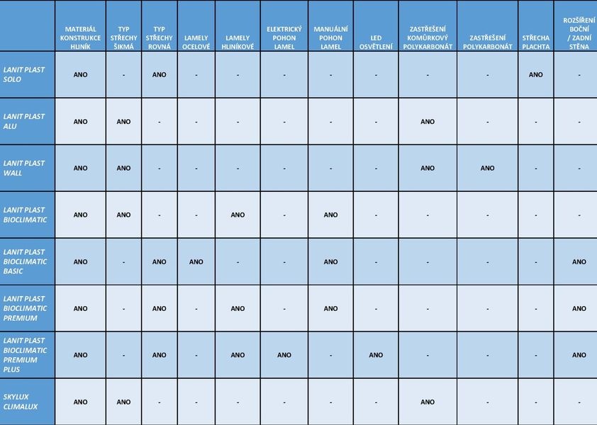 Ide o základnú verziu bioklimatickej pergoly LanitPlast s vodorovnou lamelovou strechou a manuálnym ovládaním strešných lamiel.