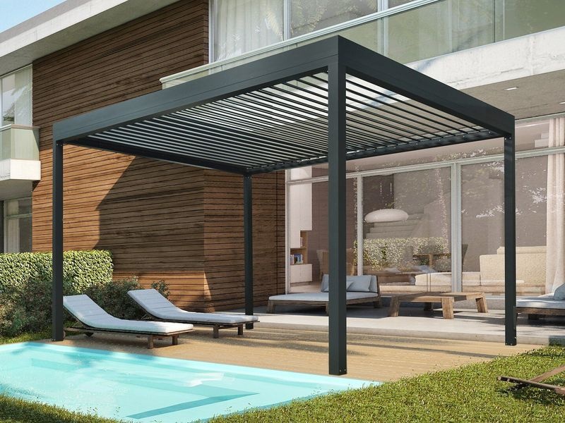 Záhradná hliníková pergola, pod ktorou nájdete príjemné miesto na oddych počas horúcich letných dní. Strecha je zložená z desiatok otočných lamiel a ochráni vás pred nepriaznivým počasím.