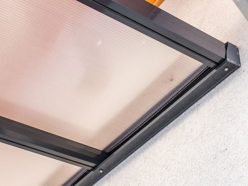 Zastrešenie pergoly je tvorené čírym dutinkovým po­lykarbonátom o hrúbke 10 mm s UV ochranou. Hliníková pergola Terrassendach Original je oproti iným výrobcom, ktorí obvykle ponúkajú 6 mm polykarbonátové dosky, oveľa odolnejšia voči krúpam.