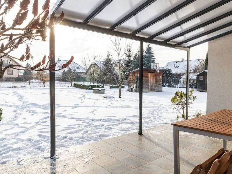 Zastrešenie pergoly je tvorené čírym dutinkovým po­lykarbonátom o hrúbke 10 mm s UV ochranou. Hliníková pergola Terrassendach Original je oproti iným výrobcom, ktorí obvykle ponúkajú 6 mm polykarbonátové dosky, oveľa odolnejšia voči krúpam.