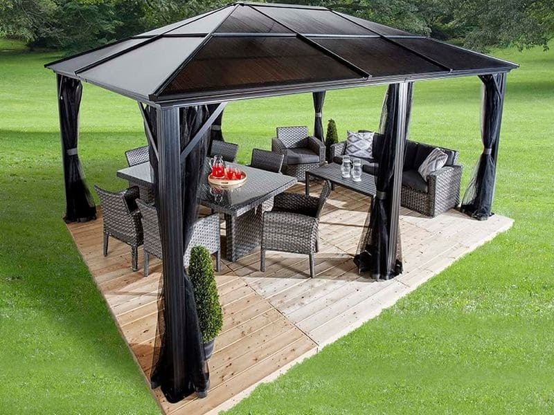 Střecha altánu je vyrobena z 8 mm silných dvojitých lamel. Zaručuje obzvláště vysokou stabilitu a snadno odolává povětrnostním podmínkám, jako je déšť, sníh nebo slunce (UV záření). Vydrží výjimečné zatížení sněhem 125 kg/m² Díky tomu je možno altán nechat na svém místě po celý rok.