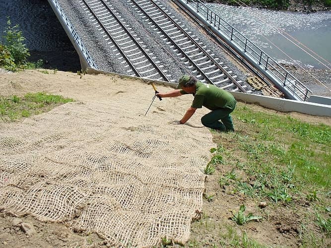 Jutová geotextília je vhodná na terén do sklonu 30°. Aplikuje sa na upravený svah (zeminu). Slúži ako dočasná ochrana proti erózii. Zabraňuje splavovaniu osiva a jemnejších častí zeminy. Využíva sa na strmých svahoch násypov a železníc alebo na zazelenenie násypov oporných múrov.