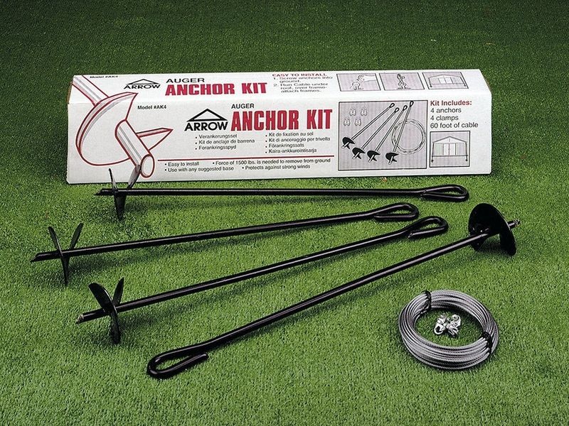 Kotviaca sada pre domčeky ARROW. Ide o sadu 4 kotiev do zeme, laná a úchytky, pomocou ktorých jednoducho a správne pripevníte domček k zemi.