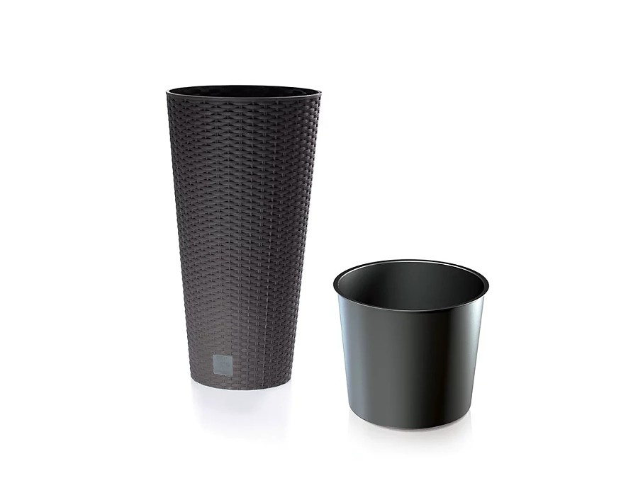 Vysoký kvetináč s vnútornou vložkou pre umiestnenie rastliny do horného dielu konštrukcie. Kvetináč do interiéru i exteriéru. Vyrobené z odolného plastu v imitácii ratanu.