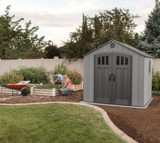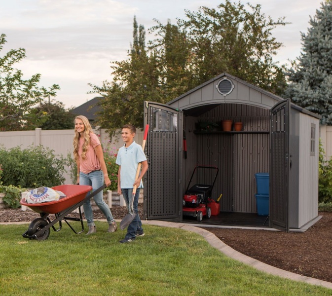 Súčasťou domčeka sú aj veľké dvojkrídlové dvere, ktoré umožňujú jednoduchý prístup a pohodlné uloženie vybavenia. Bez problémov v ňom uskladníte aj rozmernejšie záhradné náradie.