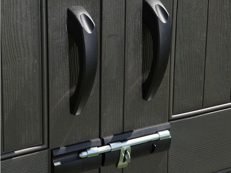 Súčasťou domčeka sú aj veľké dvojkrídlové dvere, ktoré umožňujú ľahký prístup a jednoduché uloženie vášho vybavenia. Môžete tak v domčeku bez problémov uskladniť aj širšie záhradné náradie.