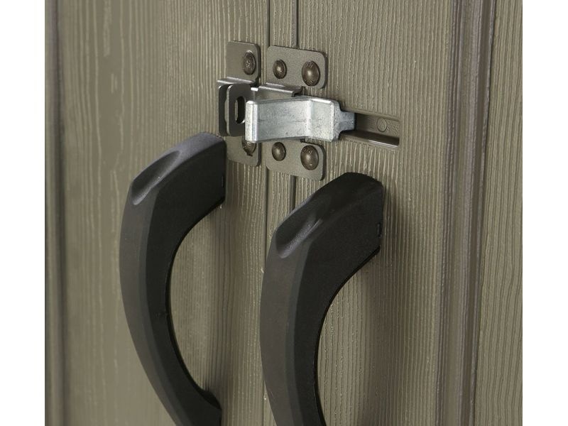 Záhradný domček je ďalej vybavený dvojitými dverami na pántoch s presklením, ktoré zaisťujú väčší komfort pri ukladaní náradia a iného vybavenia do plastového domčeka. Vďaka hladkému, svetlosivému povrchu stien kôlňa prirodzene a nenápadne zapadne do takmer každej záhrady.