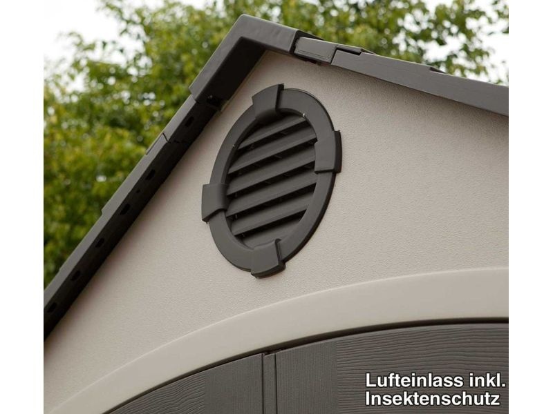 Záhradný domček získava svoju obrovskú stabilitu vďaka konštrukcii z dvojstenného, kovom vystuženého HDPE plastu (tvrdý polyetylén). Strešná konštrukcia z vysoko výkonnej ocele vydrží zaťaženie až 115 kg/m² a ideálny sklon strechy 23 % navyše umožňuje rýchly odtok vody a snehu. Súčasťou záhradného domčeka je protišmyková podlaha (v cene dodávky).