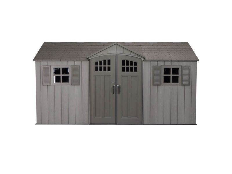 Záhradný domček je ďalej vybavený dvomi dvojitými dverami na pántoch s presklením, ktoré zaisťujú väčší komfort pri ukladaní náradia a iného vybavenia do plastového domčeka. Vďaka hrubému povrchu stien v tmavosivej farbe („Rough-Cut“ s imitáciou dreva) je kôlňa nielen praktickým prístreškom pre vaše náradie a záhradné potreby, ale aj skutočnou ozdobou vašej záhrady.
