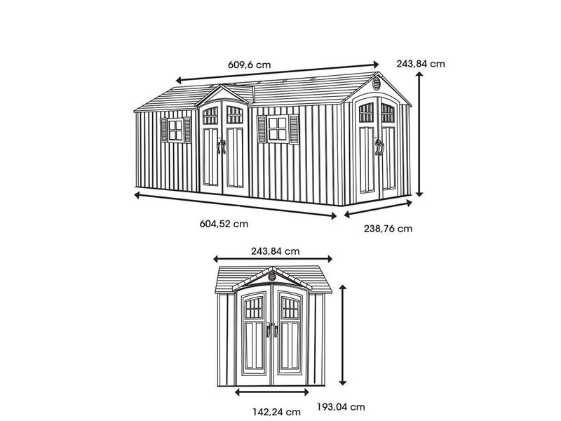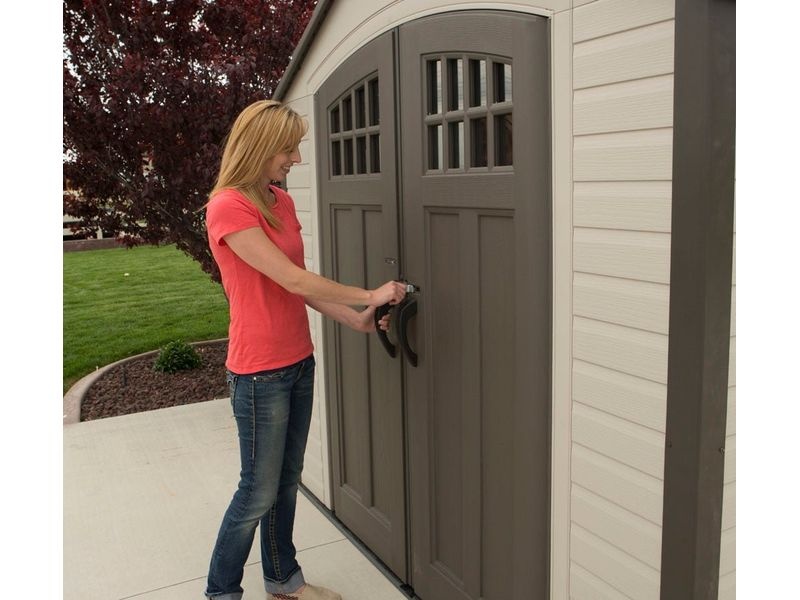 Záhradný domček je ďalej vybavený dverami – dvomi dvojitými krídlami na pántoch s presklením, ktoré zabezpečujú väčší komfort pri ukladaní náradia a iného vybavenia do plastového domčeka. Vďaka hladkému, svetlosivému povrchu stien prístrešok prirodzene a nenápadne zapadne do takmer každej záhrady.