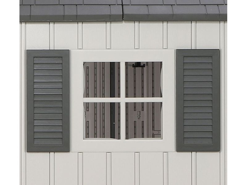 Zahradní domek je dále vybaven dvojitými dveřmi na pantech s prosklením, které zajišťují větší komfort při ukládání náčiní a jiného vybavení do plastového domku. Díky hladkému, světle šedému povrchu stěn kůlna přirozeně a nenápadně zapadne do téměř každé zahrady.