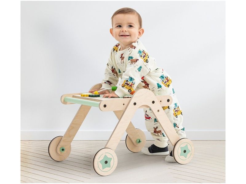 Trio WalkMe od MamaToyz je univerzálny hrací stolík, ktorý možno jednoducho prestavať na chodítko. Podporuje jemnú aj hrubú motoriku a dáva vášmu dieťaťu príležitosť urobiť prvé kroky bezpečne a s radosťou. Stolík je výškovo nastaviteľný v 4 polohách (38–54 cm). Obsahuje integrované motorické hračky, ktoré podporujú zručnosť. Pre stabilnú hru je možné kolesá zaaretovať, a zároveň môžete utiahnuť alebo povoliť všetky kolieska a ovplyvniť tak rýchlosť ich otáčania pre väčšiu bezpečnosť.