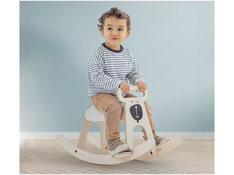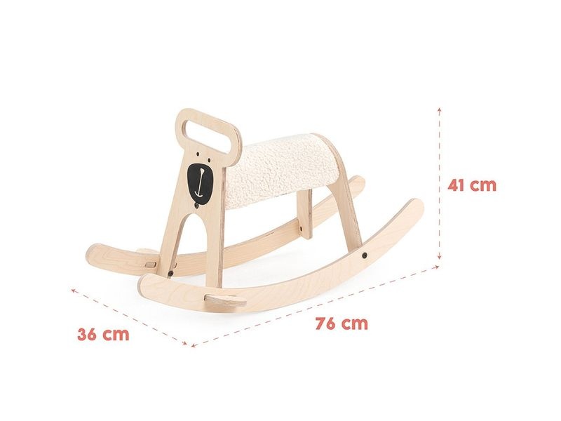 Hojdací koník je vyrobený z certifikovanej udržateľnej brezovej preglejky a potiahnutý mäkkým plyšovým sedadlom. Je bez chemikálií a má zaoblené hrany, ktoré zaisťujú maximálnu bezpečnosť a pohodlie pre vaše dieťa.