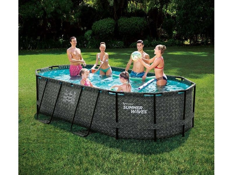 Rámová konštrukcia nadzemného bazéna sa skladá z trubiek z pokovenej ocele. Vonkajšia stena bazéna imituje sivý ratanový povrch, ktorý veľmi dobre zapadne takmer do akejkoľvek záhrady.