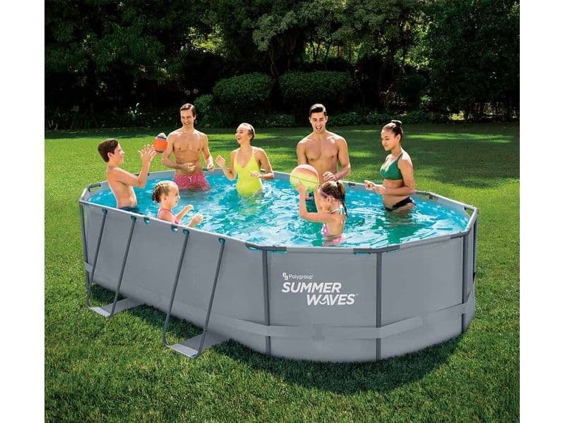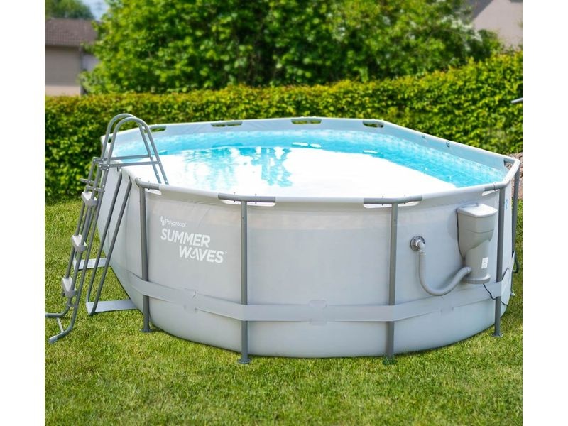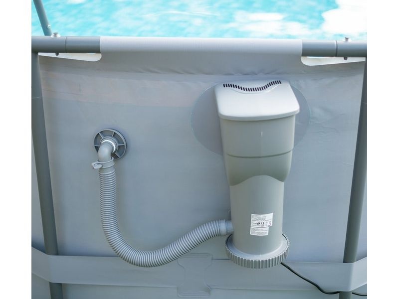 Rámová konštrukcia nadzemného bazéna sa skladá z trubiek z pokovenej ocele. Vonkajšia stena bazéna má sivý dizajn, ktorý veľmi dobre zapadne takmer do akejkoľvek záhrady.