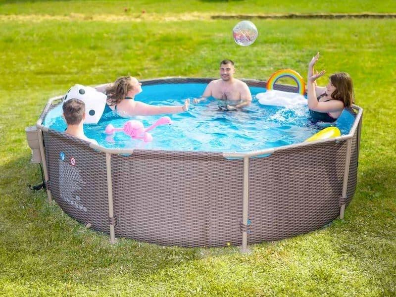 Kruhový nadzemný bazén s oceľovou konštrukciou. Rozmery: priemer 3,05 m, výška 0,76 m. Vonkajšia strana konštrukcie v dekore ratanu. Trojvrstvová bazénová fólia z PVC a polyesteru. Filtrácia je súčasťou balenia.