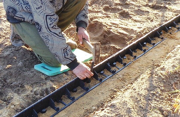 Skrytý obrubník môžete tvarovať do rôznych oblúkov alebo ho stočiť do kruhu okolo stromov. Inštaluje sa pod rovinu terénu, tak aby bolo vidieť cca 5 mm z jeho vrchnej steny. Pokiaľ oddeľujete dlažbu alebo chodníky, zvoľte aspoň takú výšku obrubníku, aká je výška dlažby.
