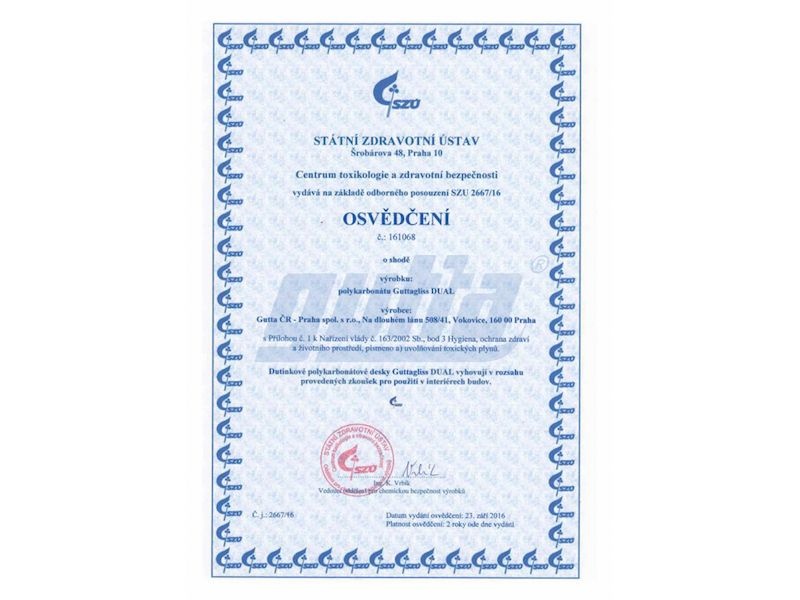 Nami dodávaný polykarbonát spĺňa všetky podmienky pre certifikáciu zdravotnej bezpečnosti toxikologickým centrom vydaným štátnym zdravotným ústavom. Môžete pestovať zeleninu bez obáv o svoje zdravie.