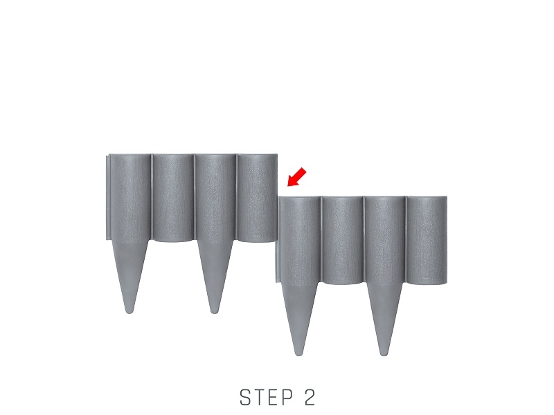 Palisádový obrubník má nízku hmotnosť, preto sa s ním pohodlne manipuluje, a inštalácia je tak rýchla a ľahká. Pomocou tŕňov zapichnete obrubníky do zeme, a tým ich upevníte v pôde. Potom už stačí len pripojiť ďalší kus palisády, ktorý zaklapnete do predpripravených zámkov u už ukotveného obrubníku. Môžete tak vytvárať neobmedzene dlhý obrubníkový pás.