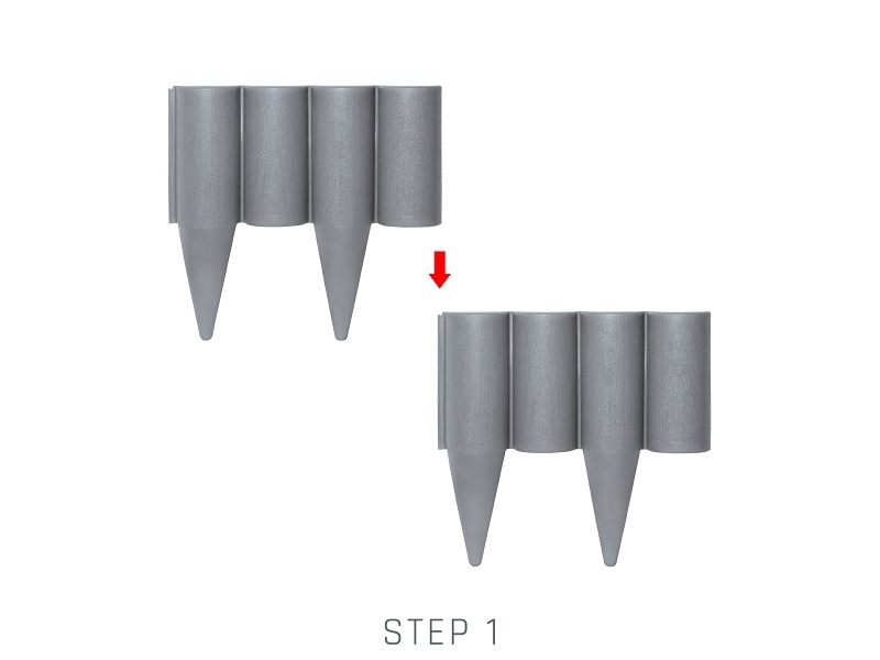 Palisádový obrubník má nízku hmotnosť, preto sa s ním pohodlne manipuluje, a inštalácia je tak rýchla a ľahká. Pomocou tŕňov zapichnete obrubníky do zeme, a tým ich upevníte v pôde. Potom už stačí len pripojiť ďalší kus palisády, ktorý zaklapnete do predpripravených zámkov u už ukotveného obrubníku. Môžete tak vytvárať neobmedzene dlhý obrubníkový pás.