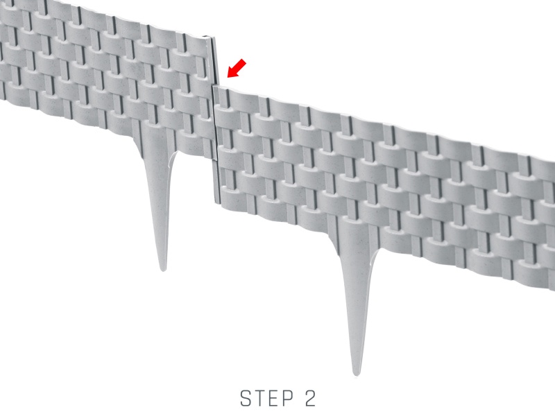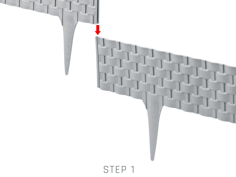 2. Pre napojenie ďalšieho dielu využite predpripravených zámkov na okrajoch obrubníku. Stačí palisádu zaklapnúť do seba a vytvoríte ľubovoľne dlhé obruby záhonov.