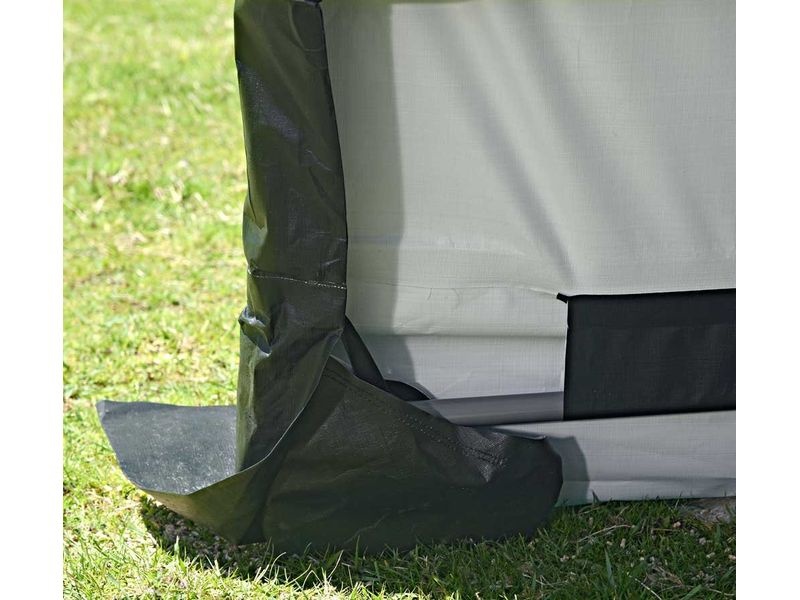 Konštrukcia plachty je zaistená upínacími račňami. V balení nájdete 4 kotvy, ktoré slúžia na zaistenie plachty, a tým je zaistená proti vetru a poveternostným podmienkam. Výška otvoru je 140 cm.