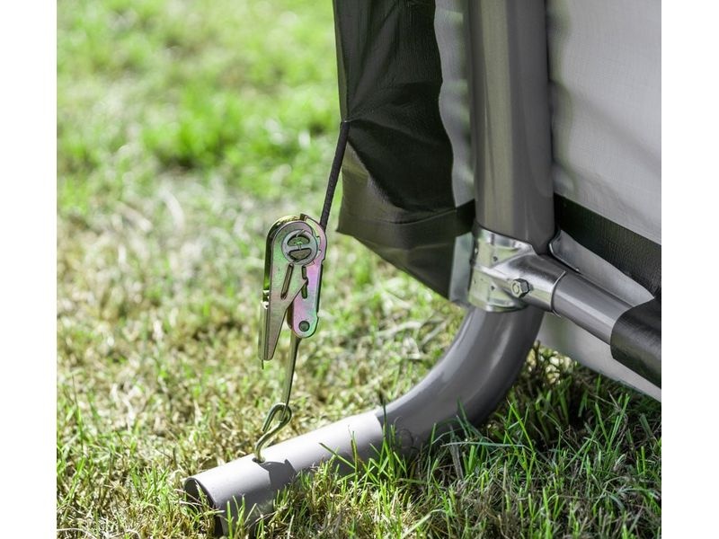 Konštrukcia plachty je zaistená upínacími račňami. V balení nájdete 6 kotiev (76 cm), ktoré slúžia na zaistenie plachty, a tým je zaistená proti vetru a poveternostným podmienkam.