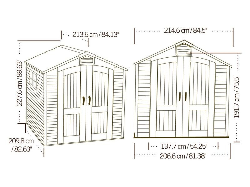 Plastový záhradný domček je vybavený dvojitými dverami na pántoch. Hrúbka dvojitej plastovej steny je 26 mm. Sklon strechy je 30 stupňov, čo výrazne znižuje množstvo a tlak snehu na strechu.