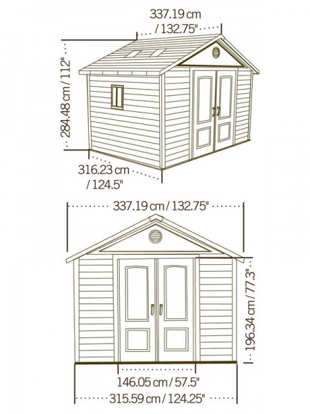 Plastový záhradný domček je vybavený dvojitými dverami na pántoch. Hrúbka dvojitej plastovej steny je 26 mm. Sklon strechy je 30 stupňov, čo výrazne znižuje množstvo a tlak snehu na strechu.