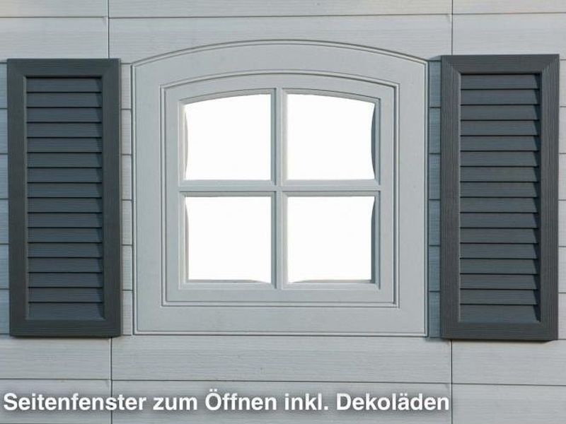 Plastový záhradný domček je vybavený dvojitými dverami na pántoch. Hrúbka dvojitej plastovej steny je 26 mm. Sklon strechy je 30 stupňov, čo výrazne znižuje množstvo a tlak snehu na strechu.