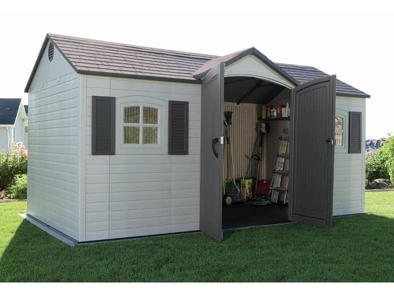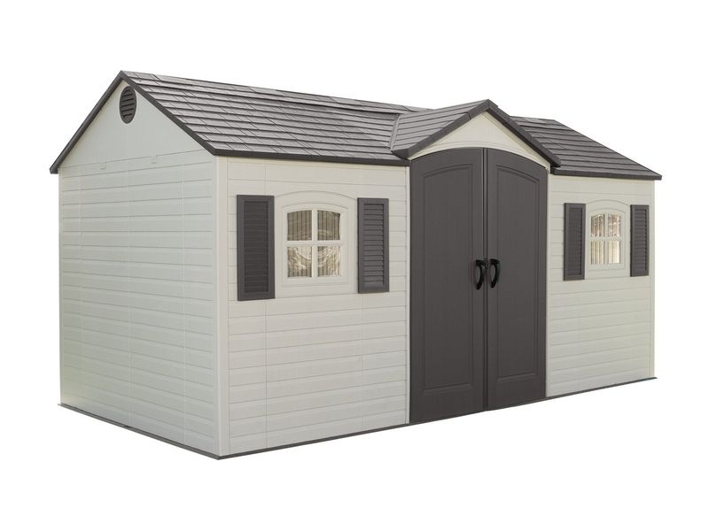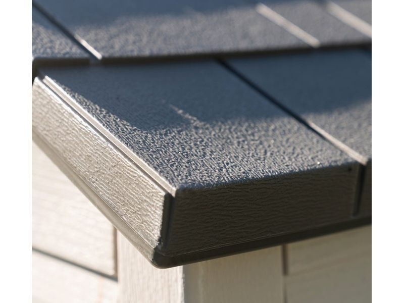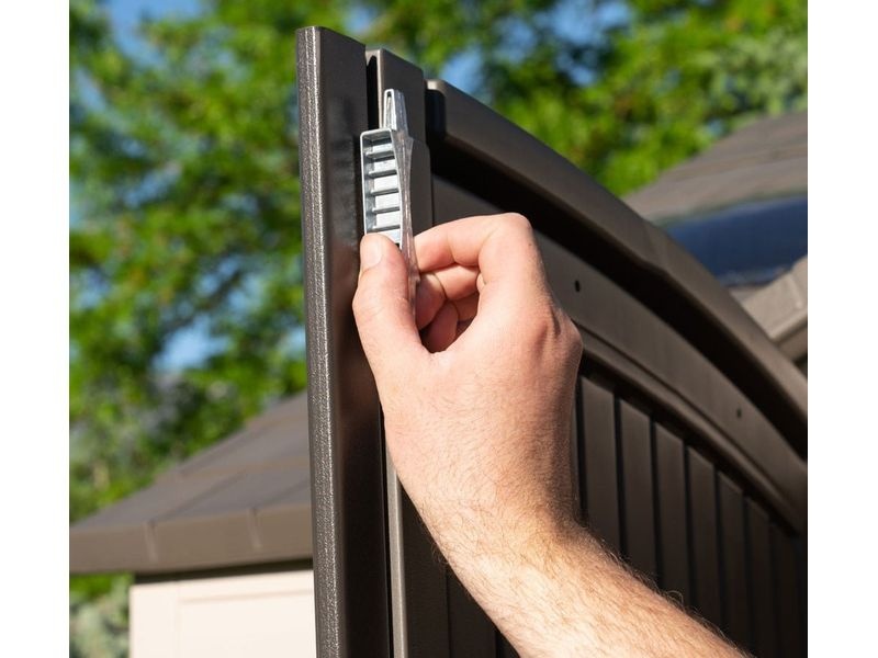 Sklon strechy pri tomto modeli záhradného domčeka je 30 stupňov, čo výrazne znižuje množstvo a tlak snehu na strešnú konštrukciu. Záhradný domček je ďalej vybavený dvojitými dverami na pántoch, ktoré zaisťujú väčší komfort pri ukladaní náradia a iného vybavenia do plastového domčeka.