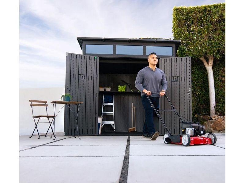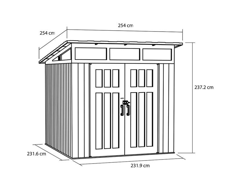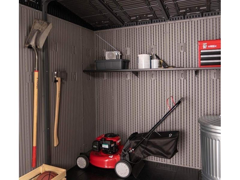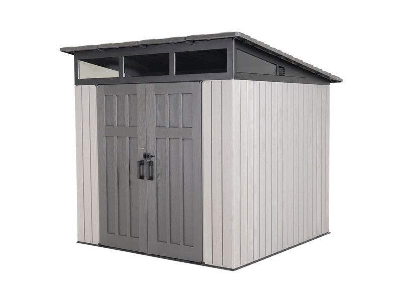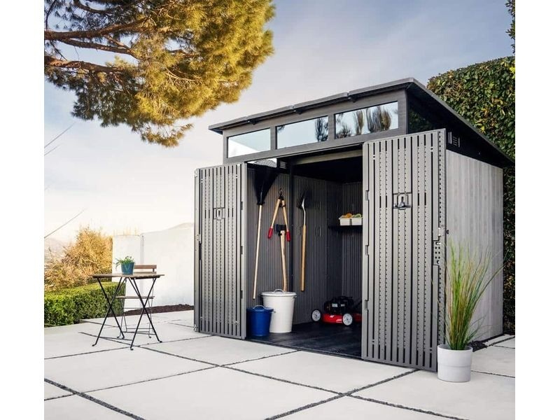 Záhradný domček je ďalej vybavený dvojitými dverami na pántoch, ktoré zabezpečujú väčší komfort pri ukladaní náradia a iného vybavenia do plastového domčeka. Vďaka hladkému, svetlosivému povrchu stien kôlňa prirodzene a nenápadne zapadne do takmer každej záhrady.