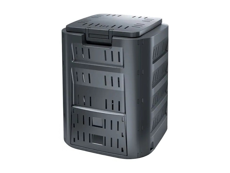 Kompostér je vybavený praktickým vekom, ktoré chráni uskladnený materiál pred dažďom alebo slnečným žiarením. Po stranách je plastový kompostér vybavený otvormi pre lepšiu cirkuláciu vzduchu a bočnými dvierkami pre jednoduché vyberanie kompostu.