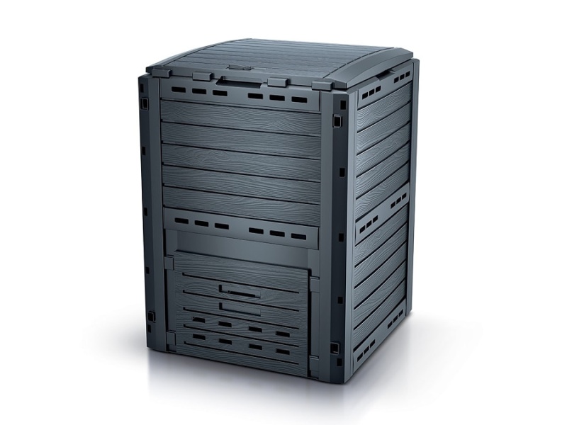 Kompostér je vybavený praktickým vekom, ktoré chráni uskladnený materiál pred dažďom alebo slnečným žiarením. Po stranách je plastový kompostér vybavený otvormi pre lepšiu cirkuláciu vzduchu a bočnými dvierkami pre jednoduché vyberanie kompostu.